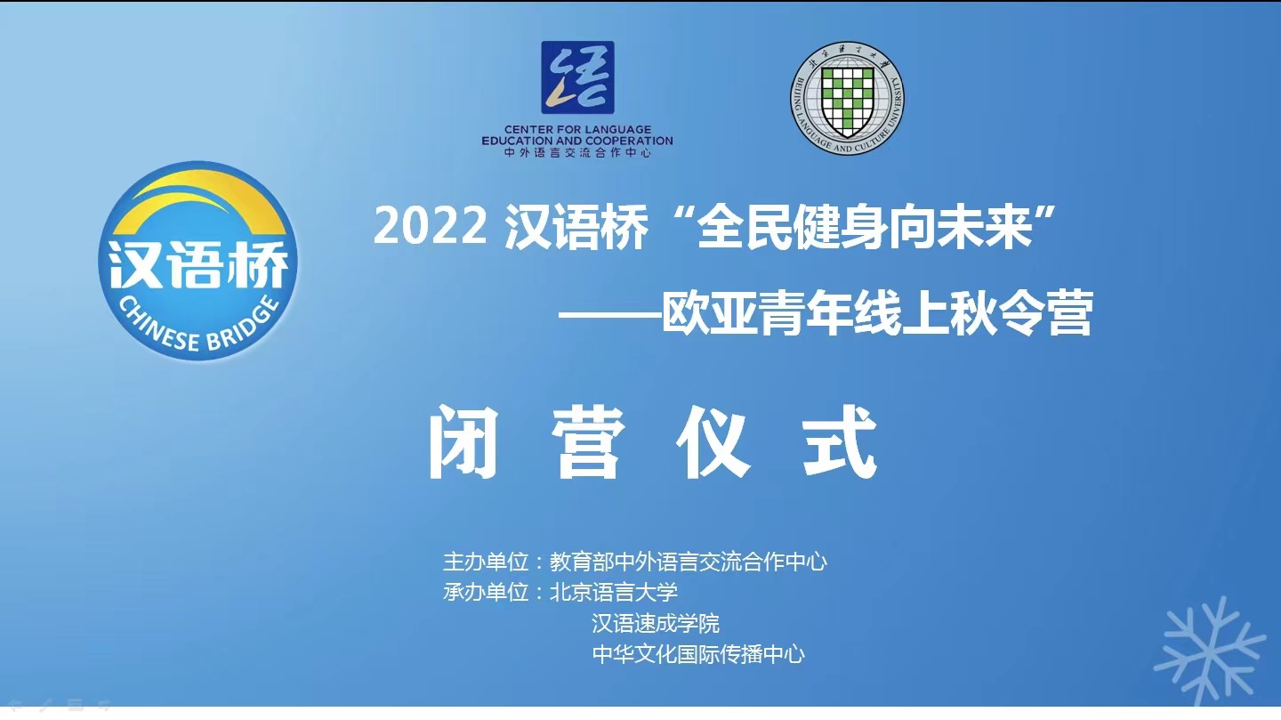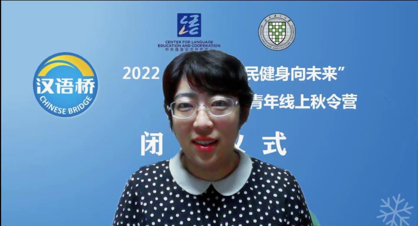 2022汉语桥“全民健身向未来”欧亚青年线上秋令营在师生们的依依不舍中落下帷幕。线上教学模式不但满足了外国学生期盼学习汉语、了解中国文化的愿望,而且大大提升了教学手段的智能化和智慧化,使教学体系更为完备、课程更为丰富,最大限度地满足了学生的学习需求。运动和健康让我们的生活更美好,“全民健身向未来”主题秋令营把营员们凝聚在一起,感受华夏健康生活理念的博大精深和后奥运时代中国体育、健康事业的蓬勃生机,彰显出“更高、更快、更强、更团结”的奥运精神。期待营员们快乐分享自己所学到的健康生活理念和生活方式,共创和谐美好的新世界,一起向未来!
