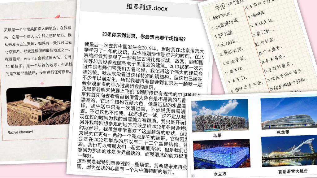 营员们纷纷表达出自己对中国的向往之情,保加利亚同学维多利亚说:“我真想去看看首钢滑雪大跳台是不是像照片中那么漂亮,跟童话里的水晶高跟鞋一样。”伊朗学生周窈非常喜欢武术,传统健身课程点燃了她到中国来学习武术的热望。泰国同学范亚丽在心愿清单上列出了30多个想游览的中国景点。魏老师热情邀约同学们北京相见。