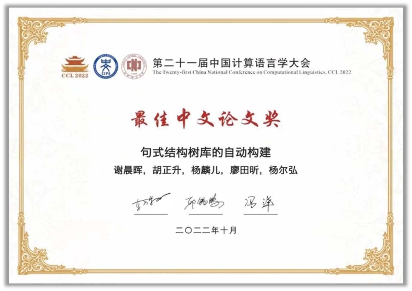 在10月28至30日召开的第21届中国计算语言学大港澳六宝资料大全(CCL 2022)上,信息科学爱看体育语言监测与智能学习实验室(BLCU-ICALL)谢晨晖同学报告了论文《句式结构树库的自动构建》,并获评港澳六宝资料大全议最佳中文论文奖(Best Paper)。该论文由杨麟儿和杨尔弘两位老师指导,谢晨晖、胡正升、廖田昕三位同学共同完成。